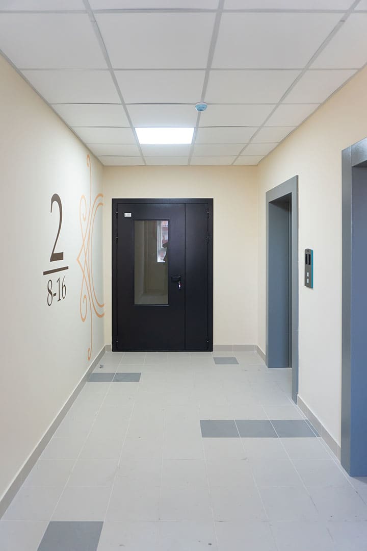 1) в холле первого этажа стены в лифтовом холле по дизайн-проекту планировалось оштукатурить под покраску, застройщик пошёл на удорожание и выложил стены керамогранитом, более практичным материалом.