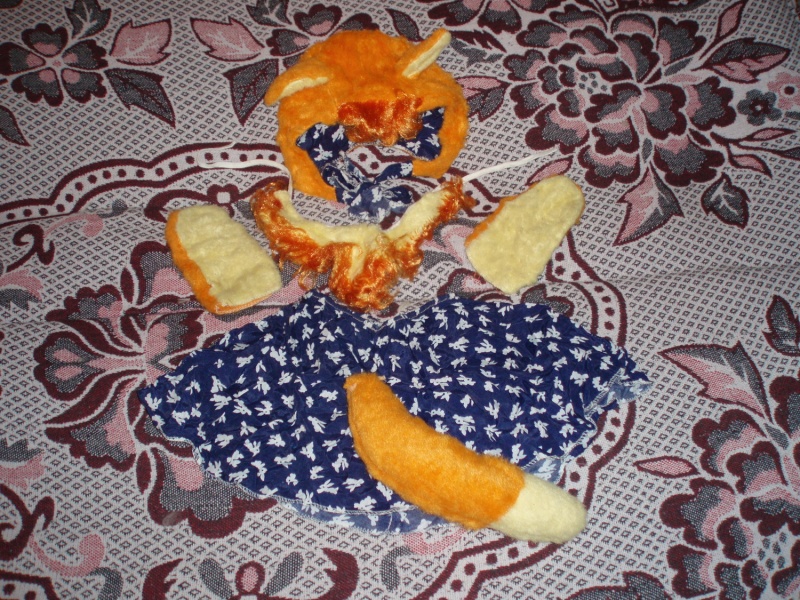 Состав костюма: шапочка, воротничок, варешки и юбочка с хвостиком. Только вот носить его не кому.