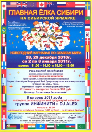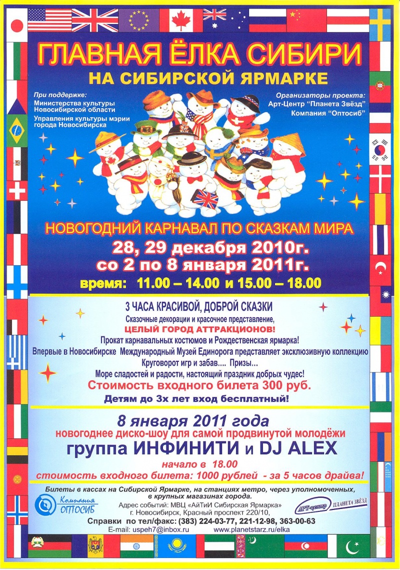 Шикарный новогодний праздник для детей! ГЛАВНАЯ ЁЛКА СИБИРИ! Новогодний карнавал по сказкам мира 28, 29 декабря 2010г, со 2 по 8 января 2011г. 3 часа красивой и доброй сказки. Целый город аттракционов. Прокат костюмов. Музей единорога. Для посещения классами- учителю вход бесплатный, доставка билетов. Телефон для справок 2211298 Елена Михайловна. Билет входной 300 рублей.Кассы распространения билетов: