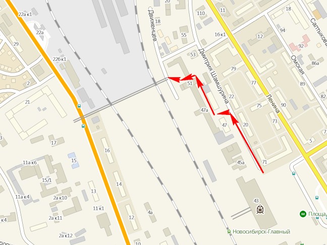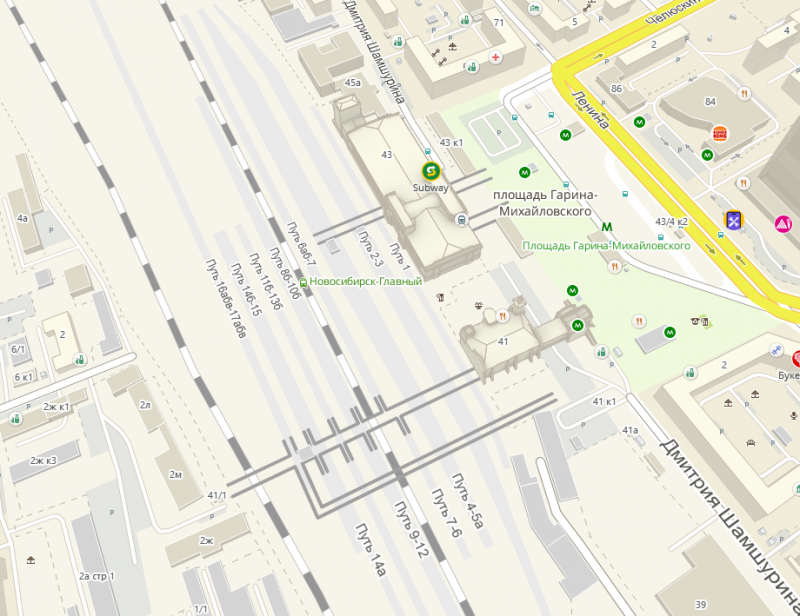 через подземный попадаете в вокзал Новосибирск-Главный (43 дом), пригородный справа (41 дом)