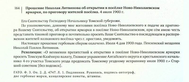 Вследствие отношения Управляющего Кабинетом ЕГО ИМПЕРАТОРСКОГО ВЕЛИЧЕСТВА и на основании 642 ст. Общ. губ. учр. II Св. Зак. изд. 1892 г., я разрешаю Вашему Превосходительству учредить в посёлке Ново-Никольском* Алтайского округа должности: