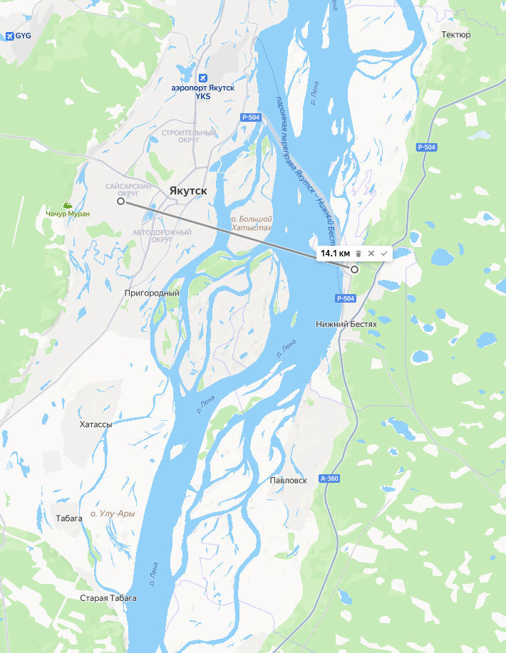 К сведению, река Лена около Якутска имеет ширину 14 км. )Правильней сказать "ширина Лены вместе с Якутском 14 км"