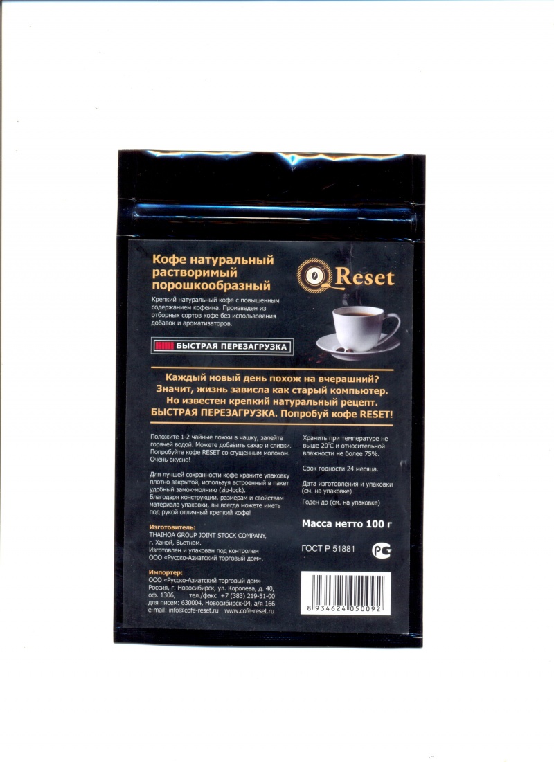 Продам кофе растворимый "RESET" 100гр,пр-во Вьетнам,мягкий пакет .В 1кор.-100шт. Цена 60 руб.Очень приличное качество!Любой объем!