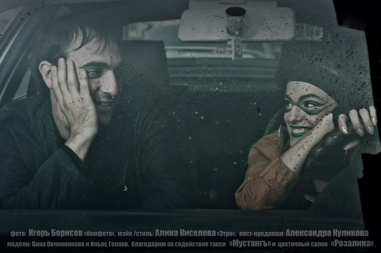 Это типа "Три тополя на Плющихе", но развернутые зеркально, водитель-девушка, она же —