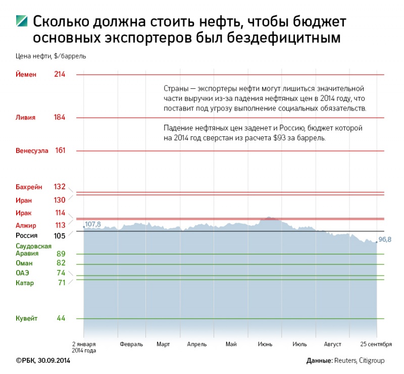 PS: Ну, и немного к вчерашней теме про цены на нефть добавлю. Вот график, отражающий бездефицитные бюджеты стран в зависимости от цен на нефть: