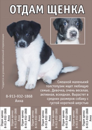 Пристройство щенка актуально? Могу расклеить объявления. Макет можно отправить см. личку