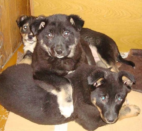 Щенков штук восемь, два достаточно больших, два маленьких, и четыре средних. Очаровательные, как и все малыши! А уже если их отмыть и откормить! В основном целиком черные, есть в белых носочках, пара светленьких.