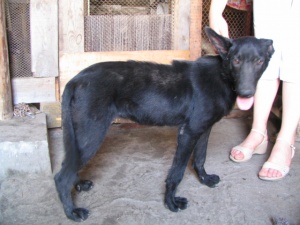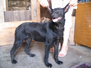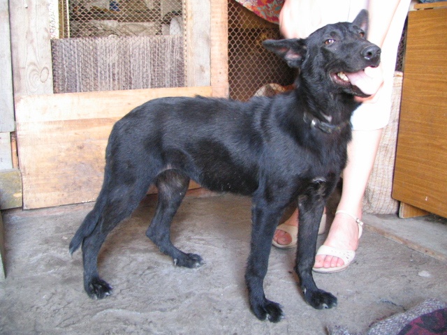 Собака среднего роста, черная, гладкошерстная, длинноногая и ушастая, очень смешная и симпатичная. Она еще совсем щенок и просто расцветет в заботливых руках.