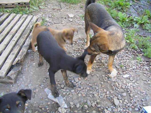 При автошколе, где я сейчас занимаюсь, есть небольшая сторожка. На ней живет 2 собаки, одна из которых ощенилась. Щенков 8, уже давольно подрощенные, примерно 2-3 месяца. Все симпатичные и очень голодные. Инструкторы несут из дома все, что могут, но прокормить 10 собак давольно трудно.