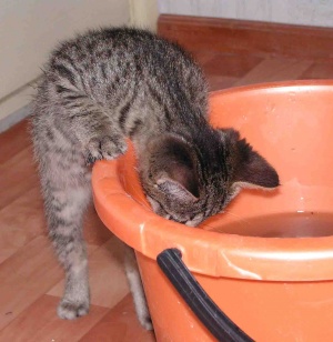 Ничего! Не утонет и не убьётся! 5 см воды - хватит только, чтобы лапы царские пакостливые подмочить и чуть напугаться!