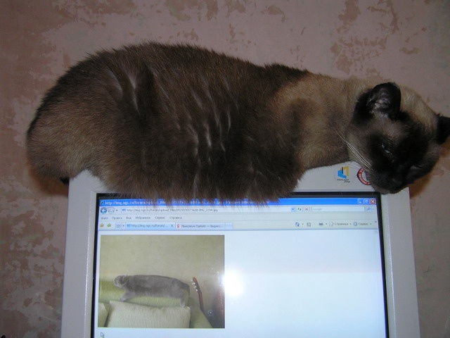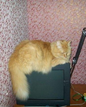 Любитель на мониторе спать. Вижу, что ему неудобно, т.к.в нем больше 6 кг веса, но он все равно мостится там.