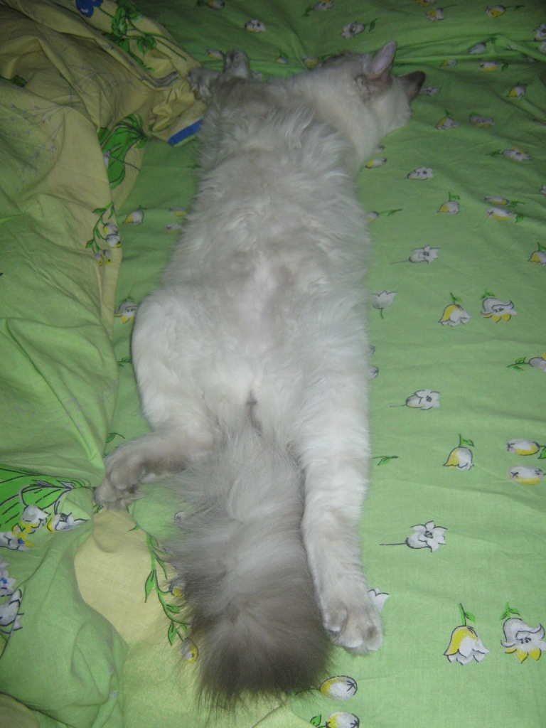 У нас таких хвостов пушистых у котов нет, но даже те что есть, когда свисают тоже мешают. Уберу под живот - через пару минут опять над монитором.