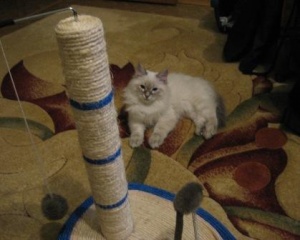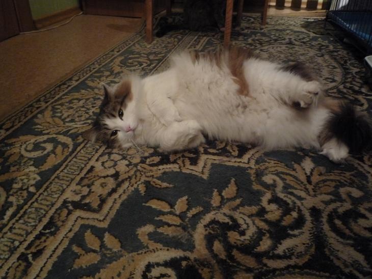 обожает хозяйку, садится вечером с ней смотреть телевизор, подставляет пузико и головку, чтобы гладили