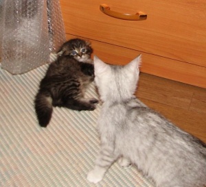 Я взяла сейчас второго котенка - одному 3, новому - полтора месяца... дерутся - спасу нет... надеюсь что обвыкнутся, но не факт...