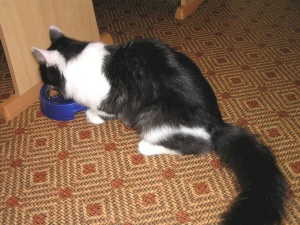 если бы не шерсть, то можно было бы анатомию кошачью изучать. Судя по наблюдениям его нагло объедает Кася (пока Пашка делает перерыв между приемами пищи, Кася успевает съесть обе порции - свою и Пашкину). Меры приняты - у NATALYA33