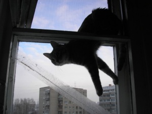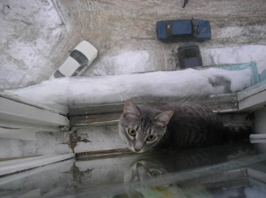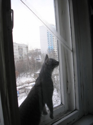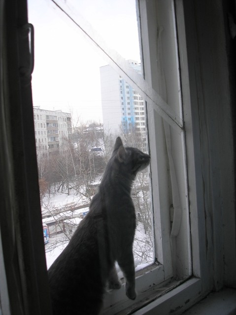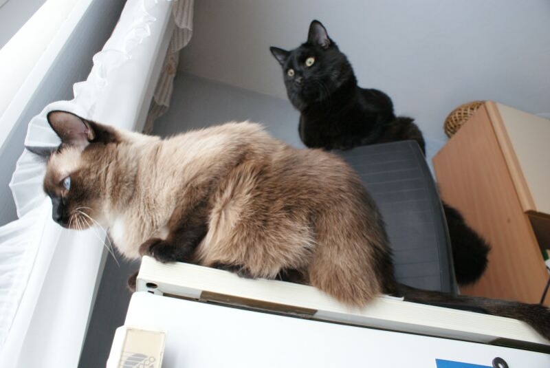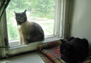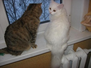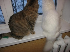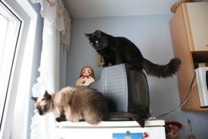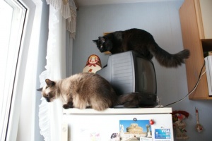 На холодильник и, стоящий телевизор на нем, залазить просто табу. Гриша это знает. А Мишка нет, да и не догадался бы, если бы не показал Гриша. Когда я зашла на кухню, они оба мостились на телевизоре, пока побежала за фотоаппаратом, Гришка слез, он то не при чем, это все Мишка, сам. На самом деле оттуда очень удобно наблюдать за птичками, чем они и занимались.