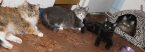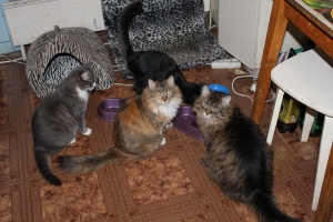 Мои кошки. Слева направо: Зоська, Моника и Тереска. На заднем плане Михаська рыщет по чужим тарелкам. Недоедает ребенок