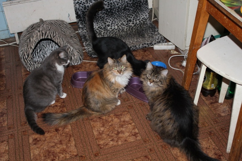 Сейчас они немного не в форме - зима, а вот летом на даче я сама ими любуюсь и соседи всегда спрашивают "откуда такие красивые кошки". Особенно всем Моника нравится (трехцветка)... Видели бы они ее, когда она ко мне попала