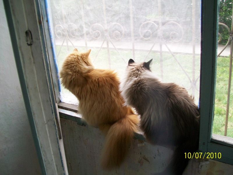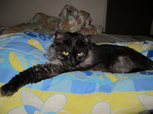 Просыпаюсь я, опять звоню Джули, которая на другом конце города уже, как и полагается, рассказываю эту историю - и тут в комнату заходит оранжево-полосатый сфинкс! Трубка падает из рук, Дася с Шаней начинают носиться, я просыпаюсь.