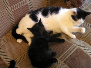 о, у меня тоже... тока у меня кошка котёнку не принимает. мелкая коша бежит к большой, может как к маме... вобщем хочет все к ней, а большая шипит!