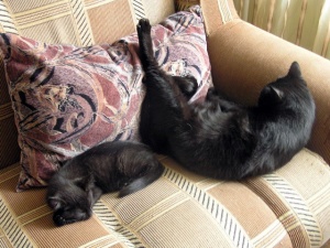 Это мама с сыном :)! А ведут себя как конкуренты! Когда коту глаз разодрали, он ходил в картонном воротнике! Сидит под табуреткой, в кошка за лезла на табуретку и пытается его когтями подцепить за больной глаз. Вот такая вот семья и ничего с этим не поделаешь!