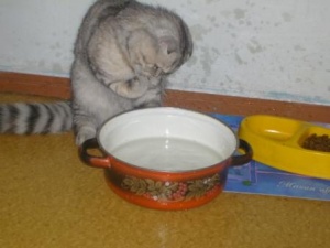 У меня кстати тоже одна кошка, когда пьет воду, всегда сначала окунает лапку, правда еще не разливала никогда воду, да и несмогла бы наверное, у них вода стоит в таком прозрачном пластиковом маленьком ведерке, обычно в них продают всякие салаты, майонез в магазинах. Мне кажется, что обычную пластиковую миску очень легко перевернуть, а вот керамическую или что-то побольше и устойчивее сложнее будет. И еще моя кошка одно время очень любила играть с водой, включишь тоненькой струйкой воду и она может ооочень долго на нее смотреть и с брызгами играть, ну и пить из-под крана тоже любит.