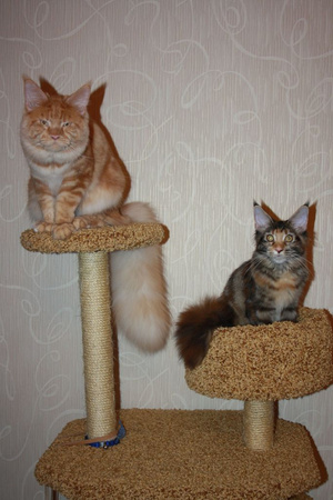 В остальном никаких особых условий для содержания именно мейн-кунов я не заметила. Вот только домики лазалки более прочные надо, а то с разбега небольшая кунотушка может и свернуть маленькие домики. И ещё им сетки на окна нужны крепче, чем обычные.