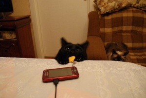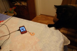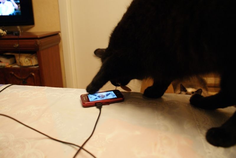 Миха ровно к телефонам. Мы оставляем. Вернее оставляли. Но цаца нравится. Придется ее отцепить, чтобы телефон не караулить. Утащить не утащит, а долбанет обо что -нибудь.