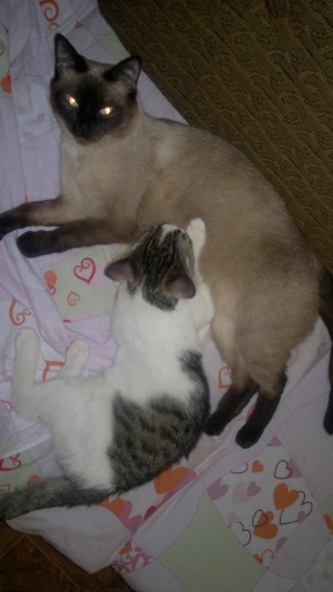 Я как-то выкладывало здесь фото своих и спрашивала: "Нормально ли когда котёнок сосёт титечку у кастрированного кота?".