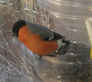 А кормушку для синиц пришлось повесить под окнами на улице. Бегаю каждое утро, насыпаю полную.