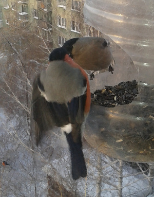 Девочки, смотрите какая красота у нас обедает!))) розовопузых то наверное все видели, а вот коричневых снегирей лично я не видела ни разу, окрас совпадает полностью, кроме цвета брюшка) Ну и так, они самые наглые, отгоняют всех птиц от от кормушки) Еще к нам прилетает поползень, мы назвали его Гарик)) Вешайте кормушки, и глазу приятно и птички сытые)
