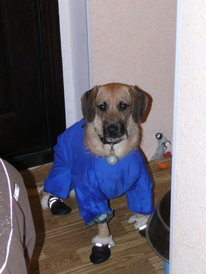А пока вот, пришли с прогулки. Виля в комбезе никогда не садится, стоит ждёт, когда освобожу его.