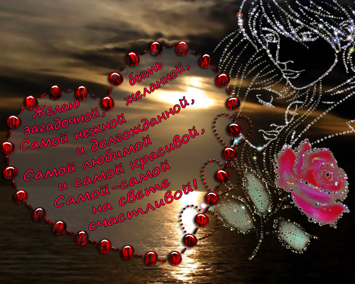 Желаю тебе хорошего настроения, душевного равновесия, мира дома, здоровья. Будь счастлива!!!!