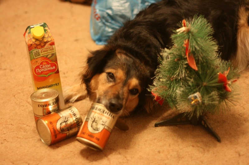 Еще немножко фото Кэрюши. Собсно, сначала была идея сделать фото собаки, грустными глазами взглядывающей на всё это безобразие (тушонку, сосиски и прочую неполезность) в своей миске. Типа хозяин в новогоднюю ночь под шафэ решил порадовать собачку, а она оказалась правильнее его.
