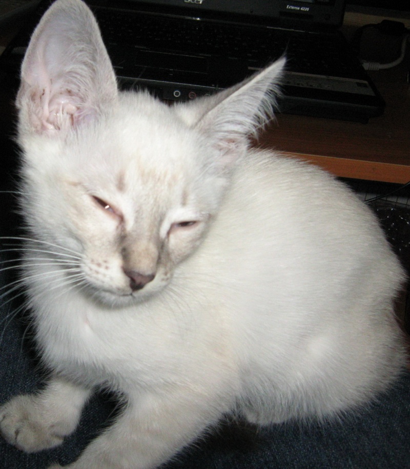 Сегодня вечером услышала под окном крики котенка. Выскочила на улицу и увидела кремовое чудо. Отмыла, накормила. Оказался сиам по всем признакам! Кремовое тельце, темные ушки, мордочка, лапки и хвостик. Большие раскосые глаза, вытянутая мордочка, а слышали бы вы наш голосище. Ребенок очень ласковый. За полчаса признал во мне мамку и теперь сидит спокойно на коленях, периодически лезет целоваться!