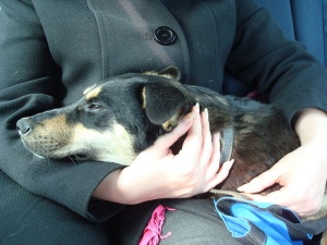 Насмешила нас по дороге. Она же была такая тихая, терпеливая девочка, как я помню, а тут скулила, выла, и так вела себя странно в машине. Вставала на все 4 лапы, что нас пугало, они еще у нее слабенькие (прооперированные). А потом выяснилась причина такого поведения - она обкакалась в машине