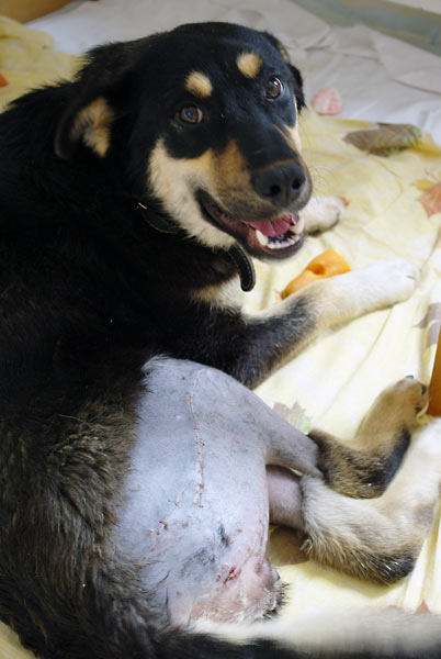 Сейчас Лена написала, что у них все хорошо. Глория по-маленьку учится ходить, только на правую заднюю лапку почти не наступает, там ей мешает штифт, который будут удалять. Будет еще у нас одна операция.
