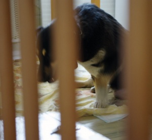 Ещё одна хорошая новость - Глория уже меньше рычит на шелть. Когда я дома, дверь на кухню открыта, а вход перекрыт деревянными икеевскими воротцами, и все собаки видят друг друга.