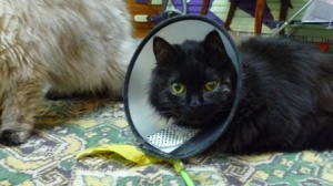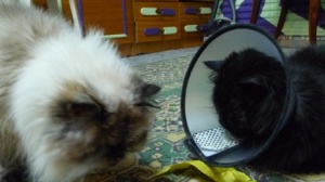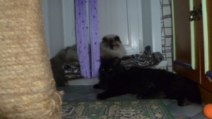 Онуфрий таки мнит себя рыцарем - спасение одноглазой пиратки Джекс считает делом чести и мчится через всю квартиру каждый раз, как наступает время протирки глаз или расчесывания ее лохматого пузика (уж больно ей эти процедуры не нравятся). Занятная картина - Нуф весьма настырно отталкивает мои руки своей тушкой в воротнике, даже куснул меня сегодня, хотя при собственных обработках агрессии не проявляет, лишь уворачивается.