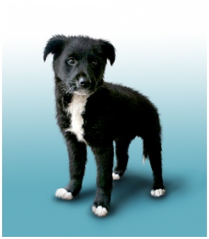 По окрасу вся черненькая, на шейке манишка такая роскошная, лапочки в белых носочках и кончик хвостика. Милашка, а не девочка. И она не совсем гладкошерстная, такая пушистая слегка.