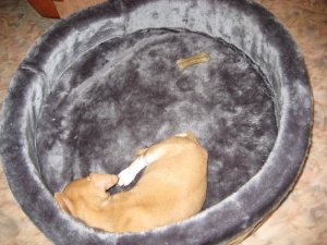Линда вчера весь день на диване тырсилась, а когда я ночью спать ложилась, её отправила в лежанку. Она и скулила и лапами на диван вставала, я её снова в лежанку отправляла. Пришлось ей смириться и спать там. Утром пришла меня будить