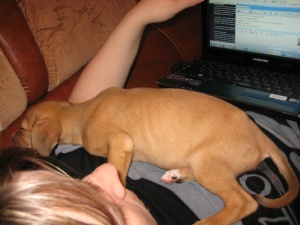 А Линда у нас - ну и пройда. Я лежу на диване с нетбуком, она встала передними лапками на диван и просится, чтобы её взяли. Ну я думаю: возьму ненадолго, поглажу и снова на пол отправлю. Так она через минуту спала уже