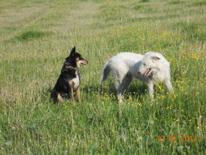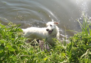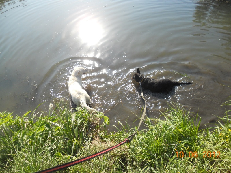 Пошли с Нюшей и Лизой гулять к речке, они там поплескались, я их пофотала, но под конец Нюша-слонопотам разыгралась, уделала меня всю с ног до головы и... сломала мне фотик!