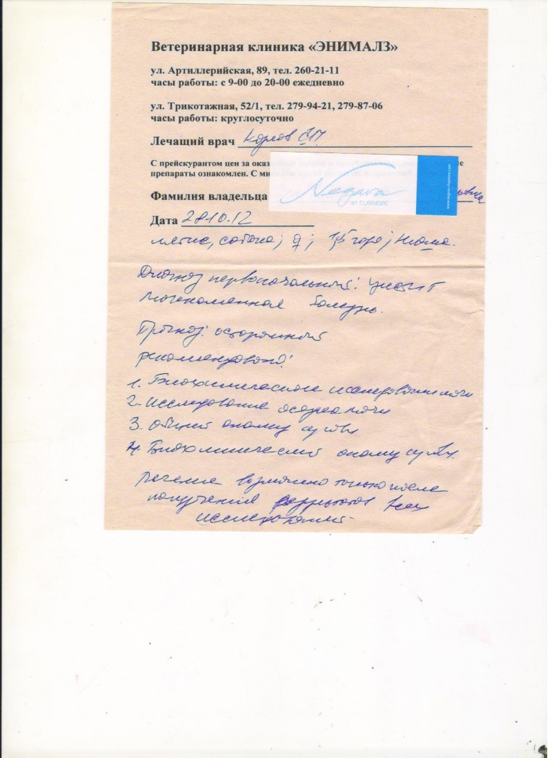 возили Нюшу в клинику на контрольный анализ (мазок на бак.посев). Антибиотики пропили, свечи проставили, посмотрим, что покажет на этот раз (очень надеюсь, что ничего). Результат будет готов через неделю, потом с ним и Нюшей к С.В. Внешне вроде всё нормально - выделений никаких нет, писиет собака нормально. Из лечения у Нюши сейчас только препарат Ренал Эдвансед для почек.