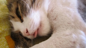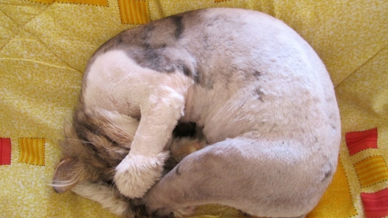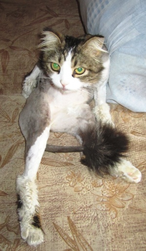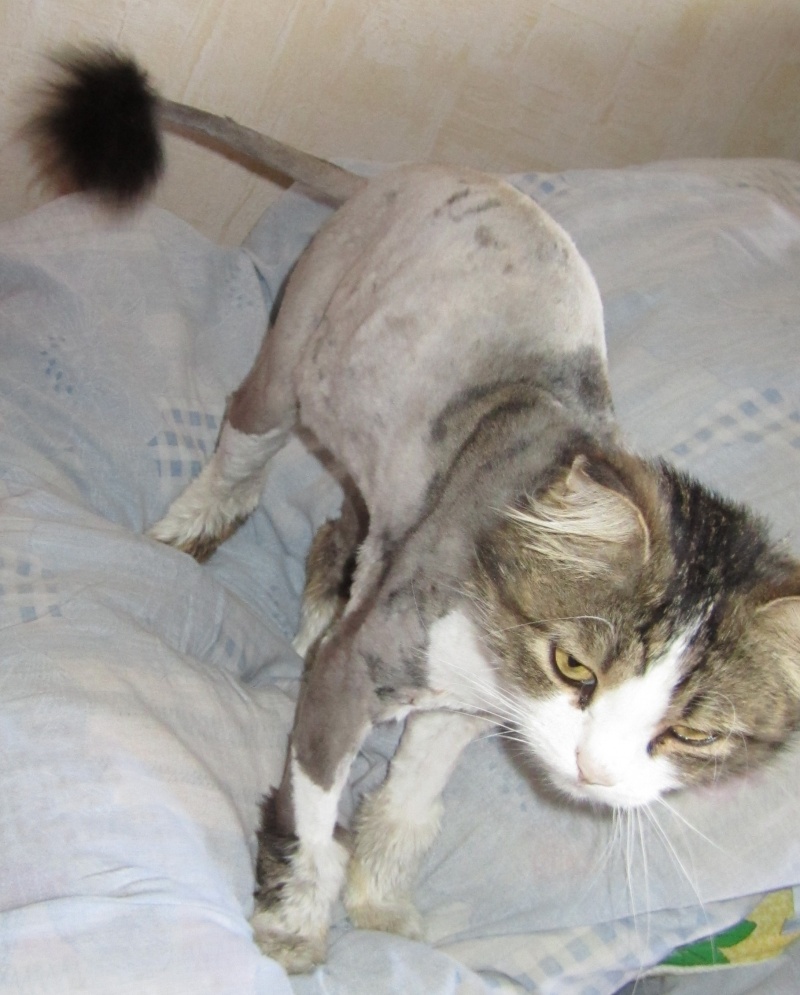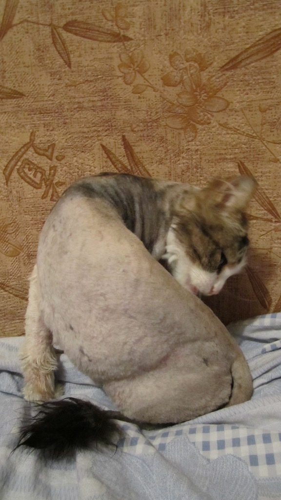 А ему не будет холодно? Понимаю, что сейчас жарко и вопрос может показаться глупым. Но кошкам никогда не бывает жарко, а, лишившись шубки, Лису может быть не комфортно. Тем более он недомогает, ему силы сейчас нужны на восстановление, а не на обогрев своего организма. Может кофточку какую-нибудь приладить?