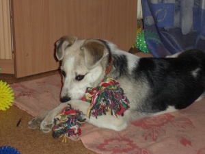 Сегодня забрала Сандру к себе. Не знаю как буду жить с пятью собаками, но больше никто не отозвался. Надеялась, что щенки страшно обрадуются друг другу и будут играть. Ага щаз.....Сандра с порога от страха рамсанула с Мергеной, та ее за это чуть не съела. В присутствии Мергеши другим собакам рычать запрещено, т.к. это всяко может навлечь на них беду