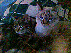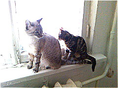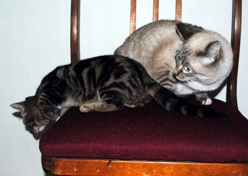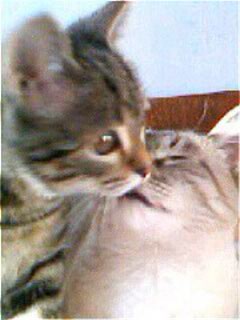 У малышки с белой грудкой есть дружок -той. Мальчик -полосатик, теперь он Марсик, единственный любимец. Девочка- бурундучок Маруся живет с Лилу-Алисой. На сей момент уже вылизывают друг другу морды. Поначалу шипели, рычали, малышка никак не уступала взрослой хозяйке, та рычит и эта, та шипит и эта, та лапой по голове, эта следом.