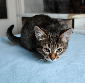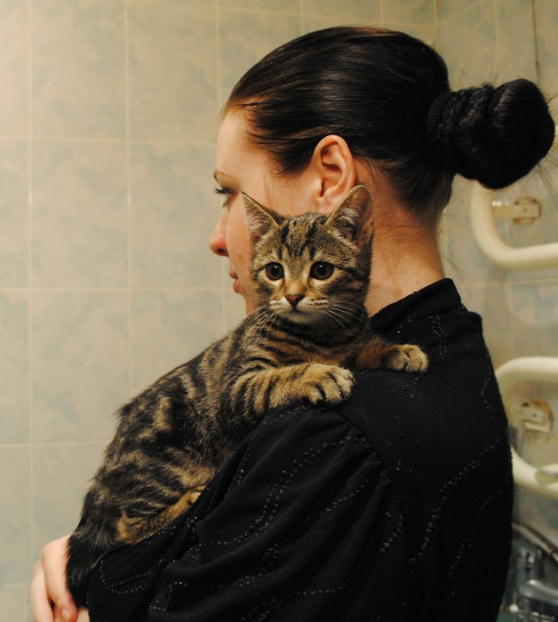 Кошка просто заглядение, глаза цвета свжезеленой травы, миниатюрная, ласковая. Залезла к Кате на ручки, потому что у нас руки были заняты ее детками, а ей тоже хотелось. Кошечка еще худенькая, но при Катином уходе скоро кошечка придет в должный вид. Пока мы ее не трогаем, пусть набирает вес, потом, когда котяток раздадим, то и кошечкой займемся.