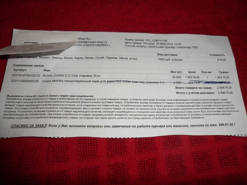 В последних чеках НМ зачеркнуто, т.к. в первый день перепутали заказ и корм не привезли, но довезли его на следующий день.