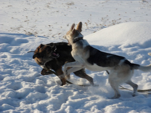 2. Мишель - уже месяца полтора как живет у меня дома. Была шуганью несусветной. Дома терпела, но не могла перенести момента, когда собираешься гулять и начинаешь проводить какие-либо манипуляции с поводком (пристегивать) и писилась (бесило несусветно). Тоже самое происходило и когда я возвращалась домой. Переборола это тем, что приходя домой стала делать вид, что ее нет и нет совсем, т.е. впринципе не фиксировала никакого внимания на ней. До того момента пока ее саму это не начинало раздражать, что ее совершенно не замечают и не начинала как-то в связи с этим подлаивать, подрыкивать, чтобы я ее заметила. Шугалась на улице людей и собак. Теперь нас интересует все - люди, собаки. Мы со всеми играем. К Мергене, это особая любовь - она на нее бросается, грызет ее, кусает в наглую за нос, а Мергене хоть бы хны. Вообщем наблюдать за дикими скачками этих двух дам занятие весьма забавное. Мишель хорошо обучается командам. Но у нее есть одна особенность - она собака одного хозяина - она никогда не будет рада всем, но от хозяина не отойдет и думаю и к нему вряд ли кого подпустит. Есть задатки охранника, но не думаю, что они сильно ей нужны, т.к. собака все таки для квартиры. Не большого размера, очень компактная и уютная с хорошим поведением. Размерами она и ее сестры как ни странно выросли меньше, чем мать. Будующему хозяину нужно лишь понять ее и вести себя правильно в первое время (период адаптации), зато потом ему будет казаться, что собаки лучше у него не было.